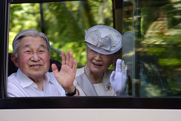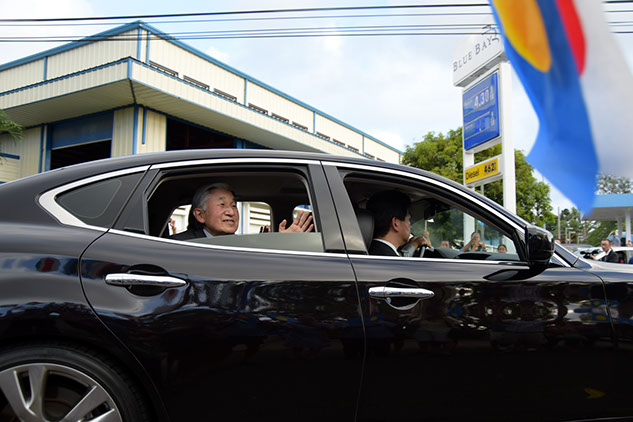 40℃の猛暑の中、窓も閉めずに島民達の歓迎にに笑顔で答える両陛下。