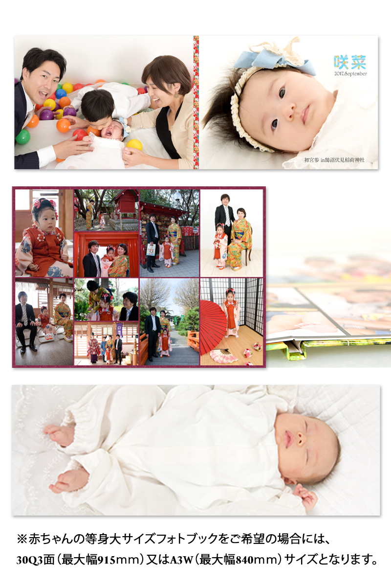 ※赤ちゃんの等身大サイズフォトブックをご希望の場合には、30Q3面(最大幅915mm)又はA3W(最大幅840mm)サイズとなります。